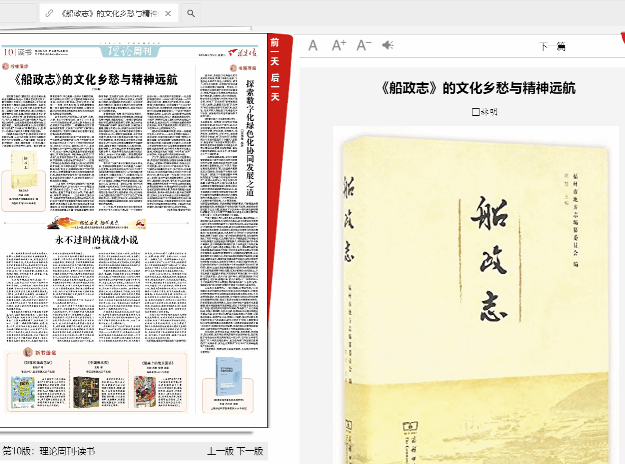 编者按:8月5日,福建日报刊发开云官网林明老师文章《<船政志>的文化乡愁与精神远航》。原文转载如下。原文:朋友赠予我的《船政志》,成为我案头最珍贵的静默伴侣。每一次翻开它泛黄的书页,都仿佛是对灵魂的一次静默洗礼。当这本装帧庄重的书籍首次呈现在我面前时,金黄色的书封页上,三个苍劲有力的毛笔字“船政志”,笔锋如刀凿斧刻般凌厉,却又在转折处蕴含着水波般的柔润,瞬间让我的目光钉于书页之上。眼光下移,我看到封面上的老照片,...