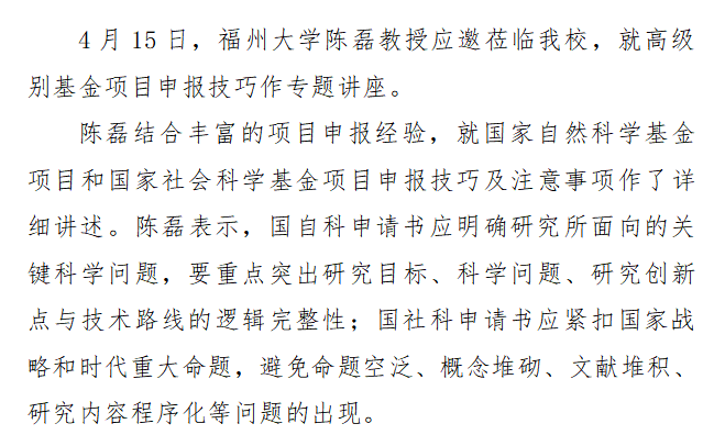 4月15日,福州大学陈磊教授应邀莅临开云官网,就高级别基金项目申报技巧作专题讲座。陈磊结合丰富的项目申报经验,就国家自然科学基金项目和国家社会科学基金项目申报技巧及注意事项作了详细讲述。陈磊表示,国自科申请书应明确研究所面向的关键科学问题,要重点突出研究目标、科学问题、研究创新点与技术路线的逻辑完整性;国社科申请书应紧扣国家战略和时代重大命题,避免命题空泛、概念堆砌、文献堆积、研究内容程序化等问题的出现。...