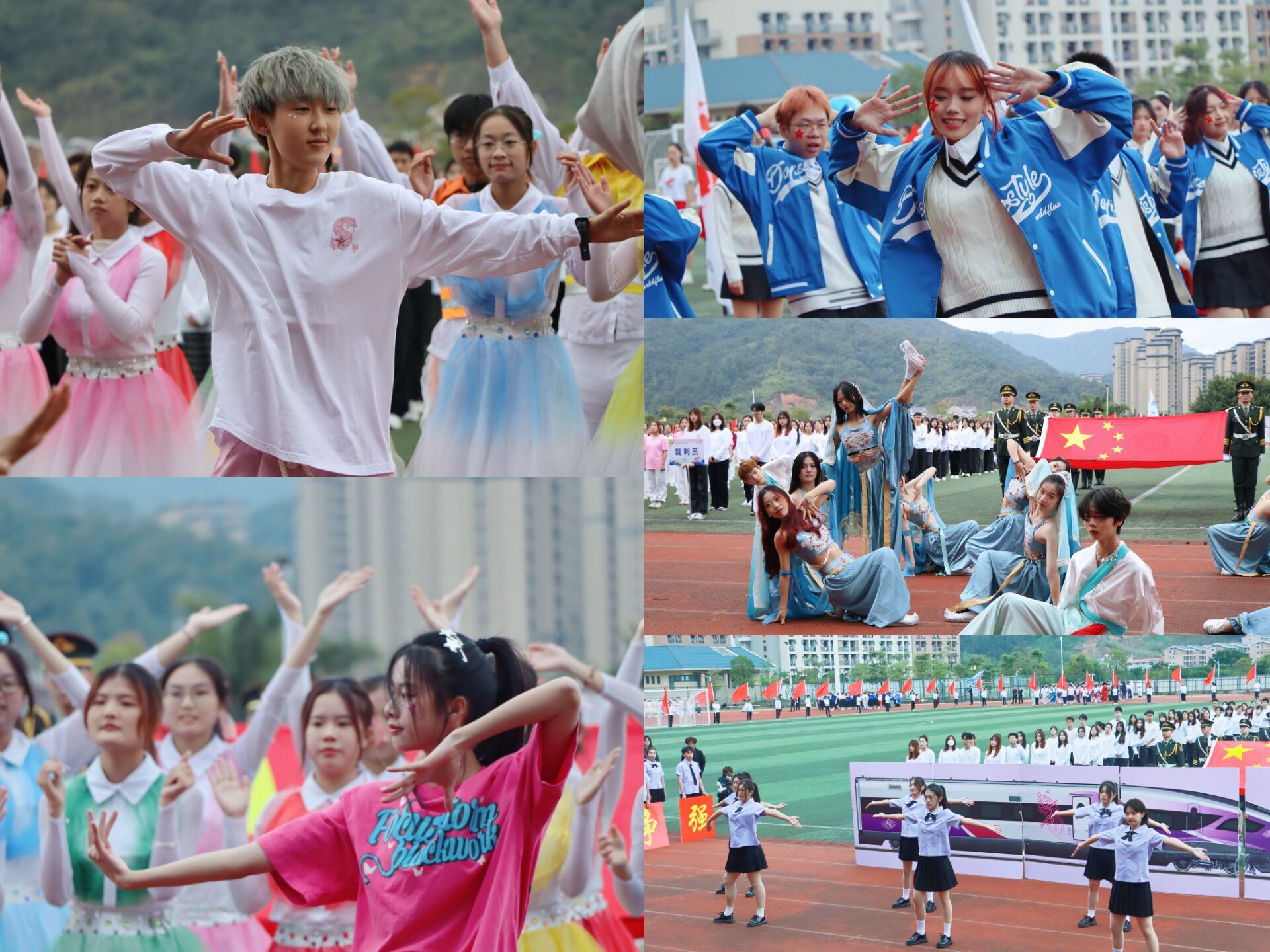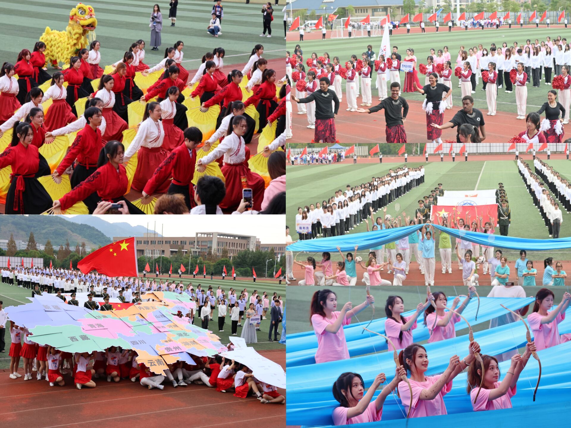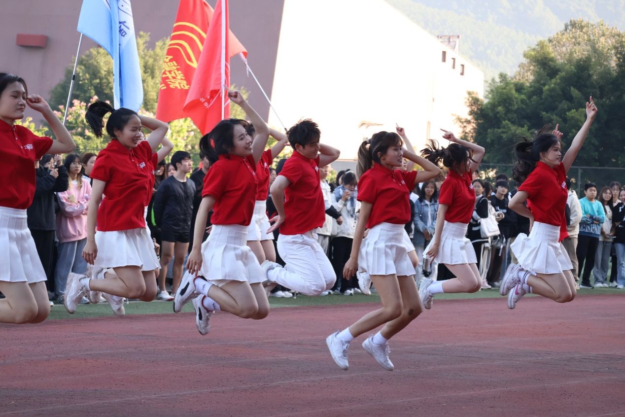 入场仪式庄重热烈,国旗、校旗、会徽方阵,彩旗队、裁判队、各二级学院代表队方阵服装统一、英姿飒爽、昂首阔步,依次通过主席台。各学院代表队传统和现代元素兼备、自信阳光、精彩纷呈的入场式展演和节奏欢快、整齐划一的团体操表演,展现了各学院的鲜明特色和新时代大学师生朝气蓬勃、奋发向上的精神风貌。跳动的音符演奏着青春的活力,动人的舞步展示着青春的风影,多次在全国大赛上获奖的学校啦啦操队也在现场作了精彩的表演。