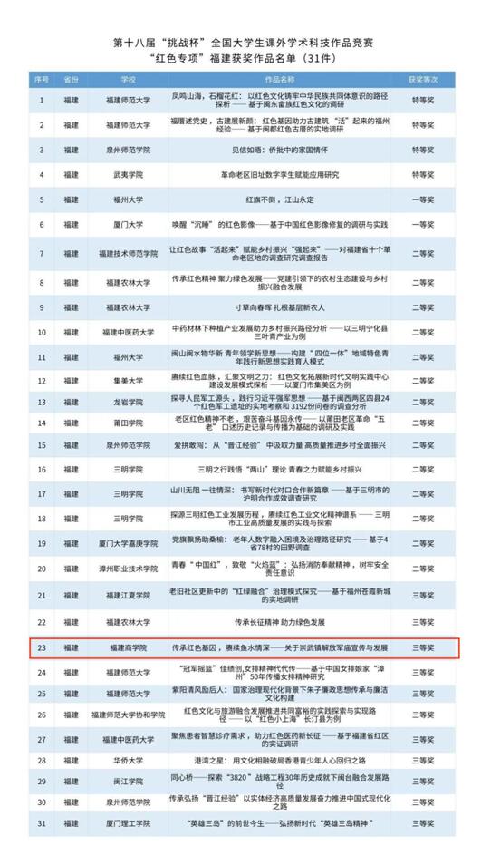 学校高度重视“挑战杯”竞赛,紧紧围绕立德树人根本任务,以“挑战杯”系列竞赛为龙头,深入实施大学生创新能力培养计划,以赛促学、以赛促创,积极培养学生创新意识,在奋力谱写中国式现代化福建篇章中激扬青春梦想、贡献青春力量。