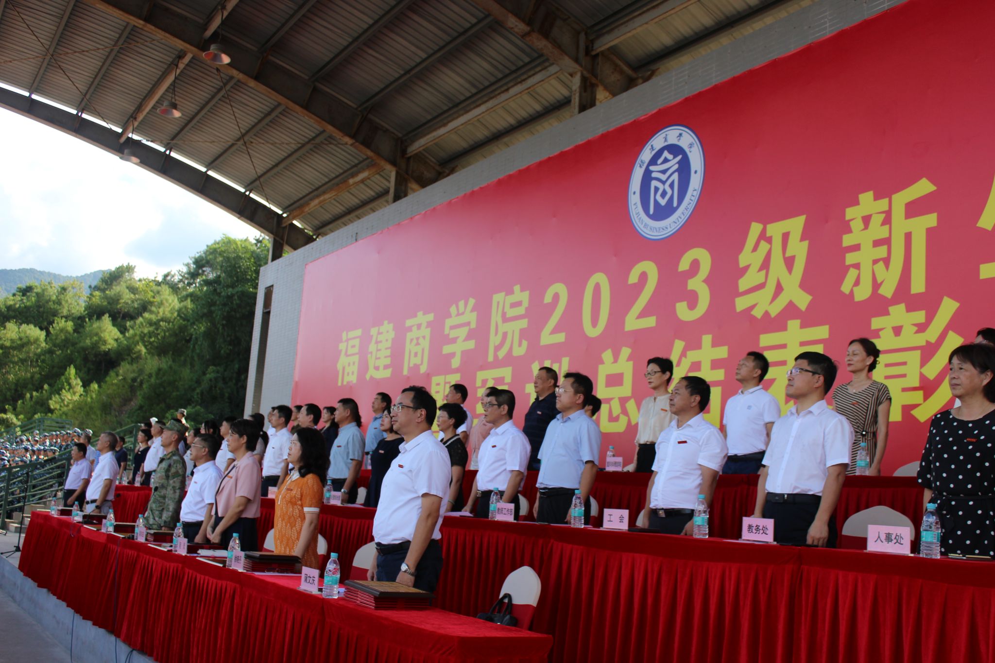 在庄严雄壮的国歌声中,新生开学典礼拉开序幕。校党委书记吴访益宣布军训汇演开始。