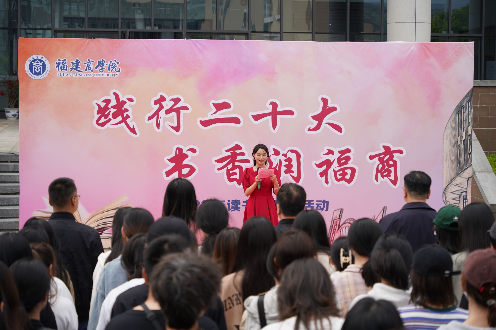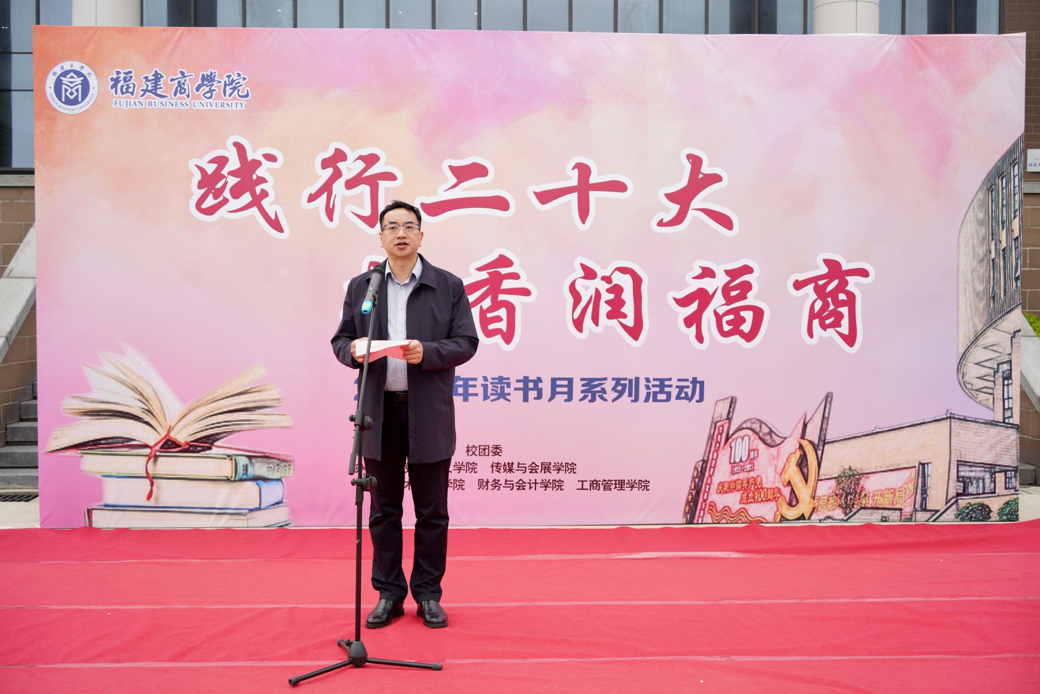 图书馆负责人向在场师生介绍了读书月系列活动方案。校习近平新时代中国特色社会主义思想读书社社长庄妍妍同学向福商学子发出倡议,号召大家养成“爱读书”的良好习惯,掌握“读好书”的学习方法,传承“善读书”的精神品质。