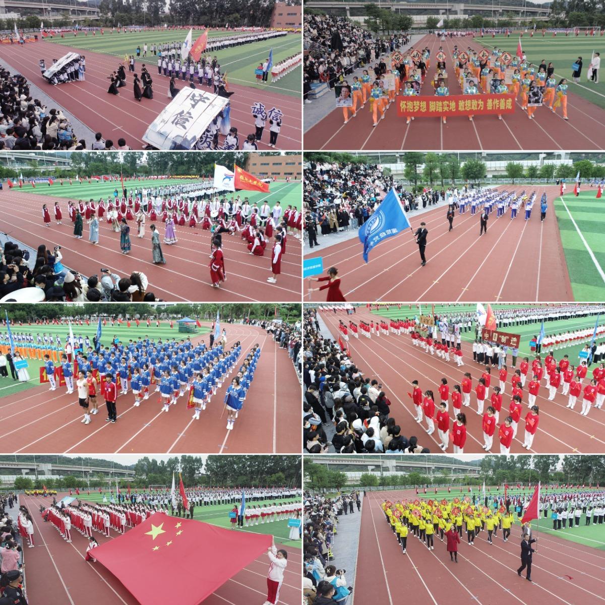 入场仪式庄重热烈,国旗、校旗、会徽方阵,彩旗队、裁判队、各二级学院代表队和机关代表队身着整齐的服装,英姿飒爽、朝气蓬勃,喊着整齐响亮的口号,迈着坚毅的步伐,依次通过主席台,并进行了精彩纷呈的入场式展演。