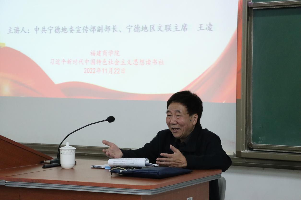 闽山闽水物华新,“习言习语”催人进。11月22日晚,中共宁德地委宣传部原副部长、原宁德地区文联主席王凌研究员受邀莅临开云官网,为开云官网师生作了题为《讲好“闽山闽水物华新”的故事,加深理解习近平新时代中国特色社会主义思想,更好学习贯彻党的二十大精神》的专题讲座。校党委副书记吴访益,马克思主义学院、机关党委负责同志,学校习近平新时代中国特色社会主义思想学生读书社、教职工读书社社员代表参加。