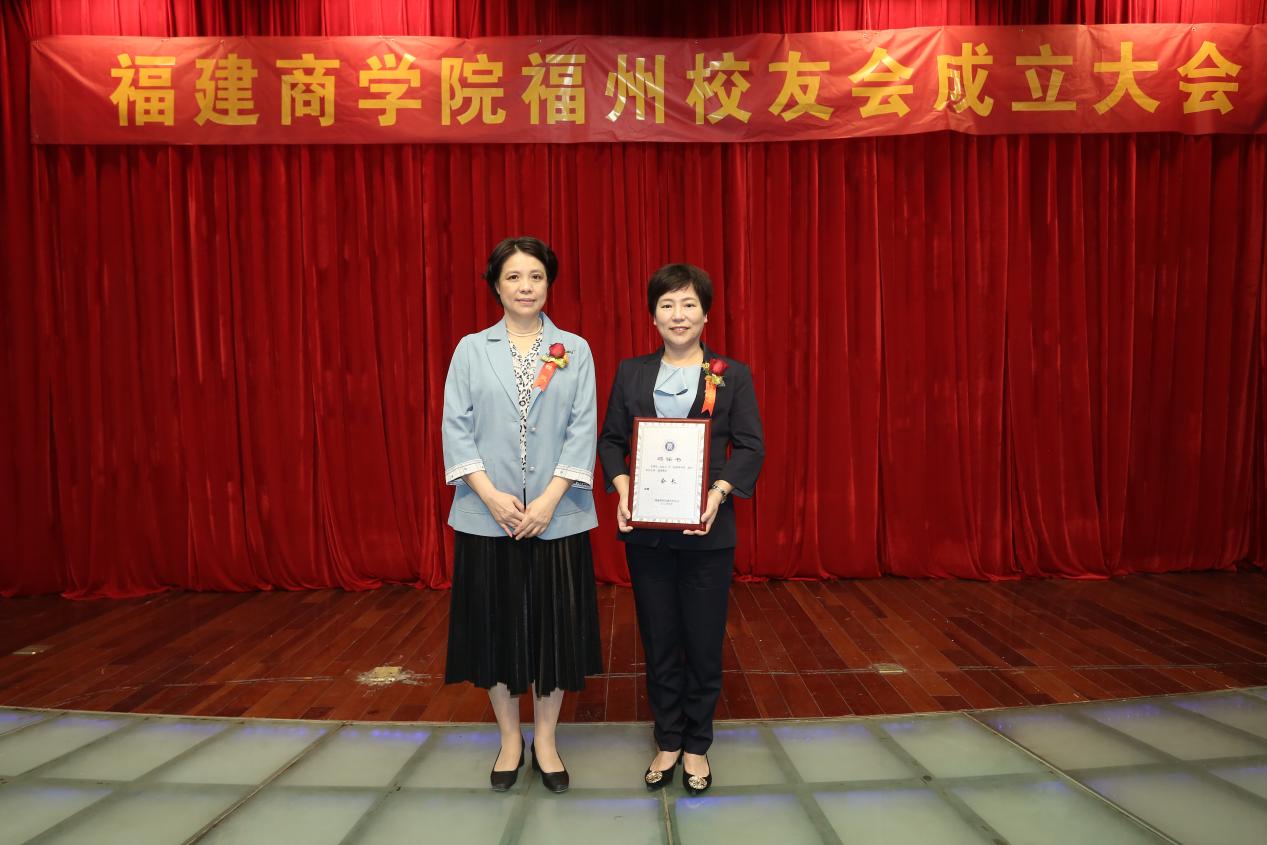 校长程灵为当选的第一届理事会会长何丽玉颁发聘书