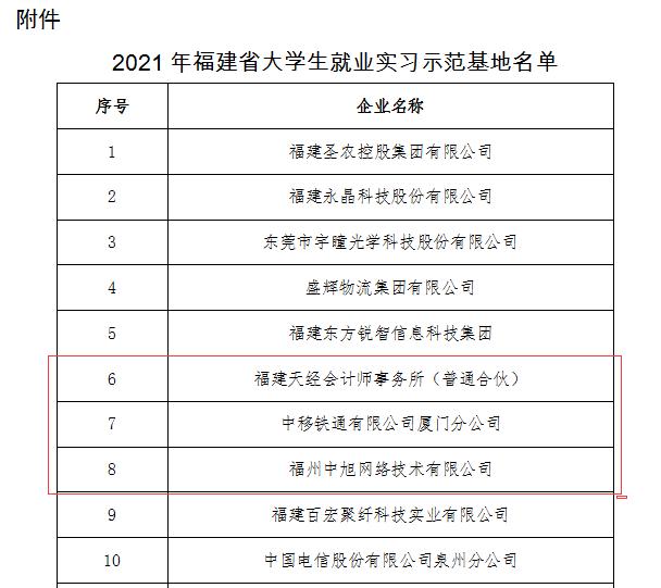 近日,福建省教育厅发布《关于公布2021年福建省大学生就业实习示范基地评选结果的通知》(闽教学〔2022〕5号),确定23家单位为2021年福建省大学生就业实习示范基地,开云官网财务与会计学院推荐的福建天经会计师事务所(普通合伙)、信息工程学院推荐的中移铁通有限公司厦门分公司和福州中旭网络技术有限公司等3家单位成功入选。