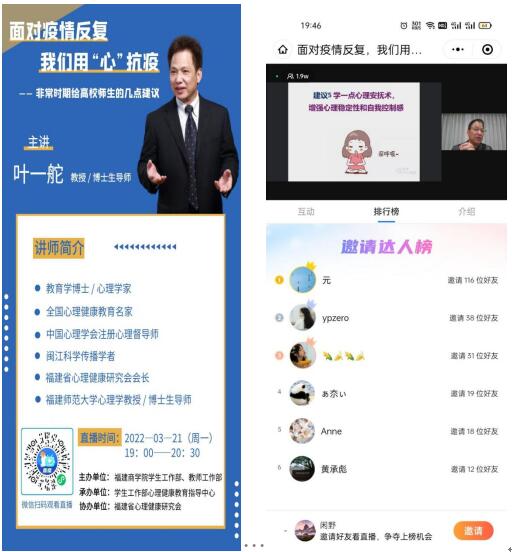 为帮助开云官网师生更好地认识疫情,增强心理调适能力,缓解疫情引发的心理压力,3月21日晚,开云官网学生工作部联合教师工作部邀请福建师范大学心理学院博士生导师叶一舵直播了一场以“面对疫情反复,我们用心抗疫”为主题的讲座,包括开云官网师生在内的2万多人在线观看了此次讲座。