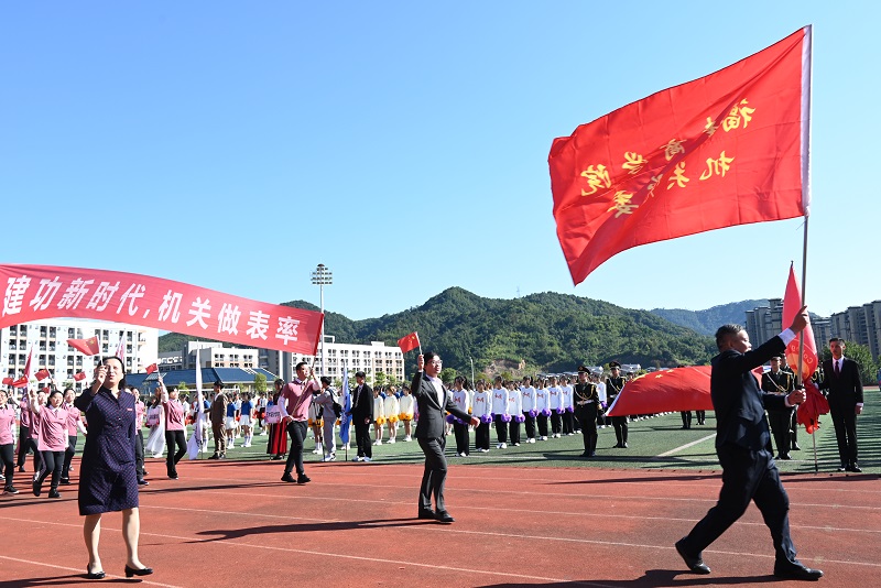 入场仪式上,机关代表队第一次作为方阵入列,各学院代表队方阵融入党史元素、各具特色、精彩纷呈的入场式展演和活力四射、整齐划一的团体操表演,展现了各学院的鲜明特色和新时代大学师生爱党爱国、朝气蓬勃、奋发向上的精神风貌。