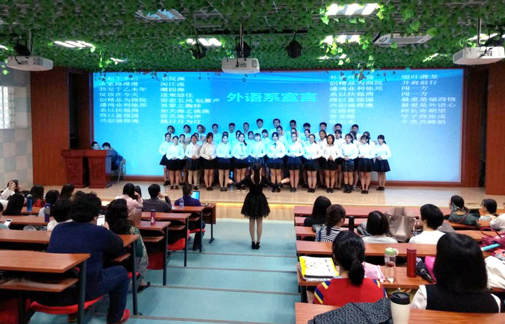 为促进融合,外语系三个校区的学生代表发出了号召——《外语系宣言》,从历史背景、专业特色和发展目标的三维度展示了“福商精神”所蕴含的正能量,表达外语系全体师生勇于承担历史使命,今后将以党的十九大精神为指导,以更高昂的姿态参与商学院建设,用真情唱响外语系这个相亲相爱的大家庭。