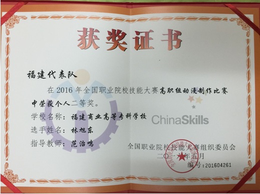 开云官网高度重视学生职业技能大赛,赛前多次专门组织专业教师对学生进行系统培训。开云官网商业美术系林旭东同学以2016年福建省职业院校技能大赛“动漫制作”赛项第一名的成绩作为福建代表队选手参加2016年全国职业院校技能大赛,在指导教师范治鸣的精心指导下,该生专业技能不断增强,比赛中沉稳应对,充分发挥了自身扎实的专业知识和较强的动手能力,取得了佳绩。