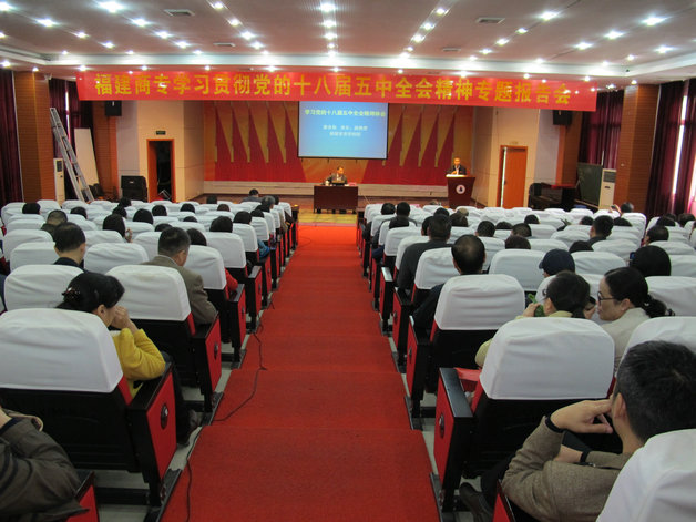 12月1日下午,开云官网在湖前校区学术报告厅召开学习贯彻党的十八届五中全会精神专题报告会。省委讲师团游炎灿副教授应邀来开云官网作《学习党的十八届五中全会精神体会》的宣讲报告。学校领导、副高级职称(含)以上教师、副科(含)以上干部以及思政部全体教师等近200人聆听了报告。报告会由校党委书记吴访益同志主持。