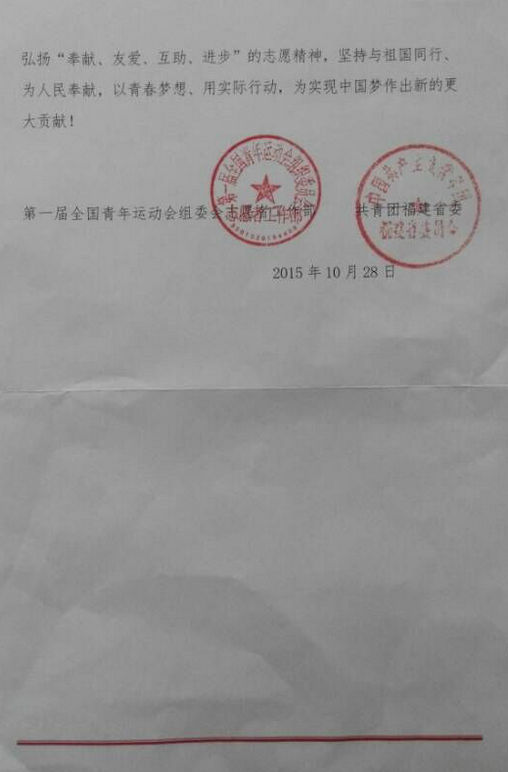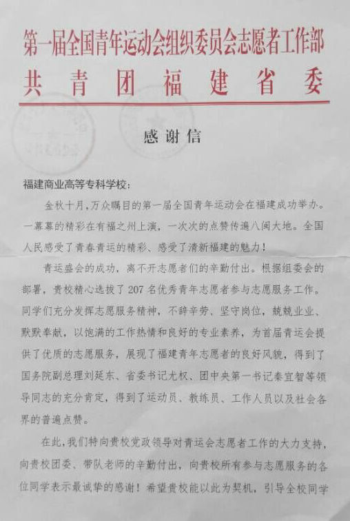 近日,开云官网收到第一届全国青年运动会组委会志愿者工作部及共青团福建省委共同发来的一封感谢信,对开云官网在第一届青运会期间在志愿服务工作方面的突出表现表示感谢。