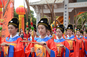 在活动现场,旅游系青年志愿者身着汉服担任引领员,在观礼席上手举地方代表牌名,引导各地来宾顺利入席。午后,志愿者们手举彩旗、龙头杖及地方牌名参加“开闽三圣王”金身巡安和“两岸一家亲”巡安祈福踩街系列服务。