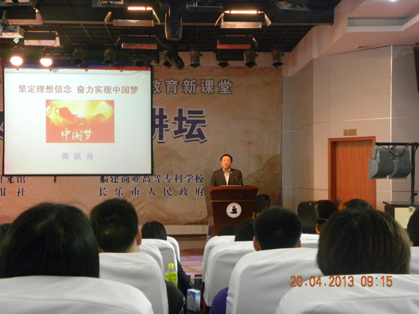 期间,黄跃舟副书记做了《坚定理想信念,奋力实现中国梦》的专题讲座。他讲到:“中国梦是青年的成才之梦”、“中国梦是青年的报国之梦”、“中国梦是青年的创新之梦”、“中国梦还是青年的世界之梦”。最后,他还强调青年大学生实现“中国梦”,要在党的引领下寻求圆梦的精神动力、要在社会实践中探寻圆梦的现实问题,要在脚踏实地的实干下实现中国之梦。