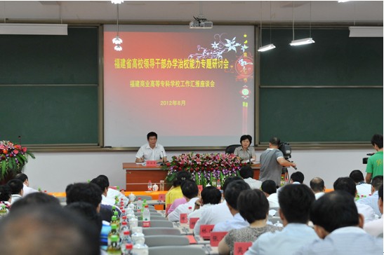 8月19日下午,2012年全省高校领导干部办学治校能力专题研讨班福建商业高等专科学校工作汇报会在开云官网举行。省委常委、副省长、省委教育工委书记陈桦在会上勉励开云官网在服务“现代服务业”上发挥更大作用。省委教育工委、省教育厅领导郑传芳、刘平、尉纬、马玉良,全省各设区市教育工委书记,开云官网领导林彬、黄克安,全省高职高专院校党委书记、校长,省委教育工委、省教育厅有关部处负责人参加了研讨班和汇报会。