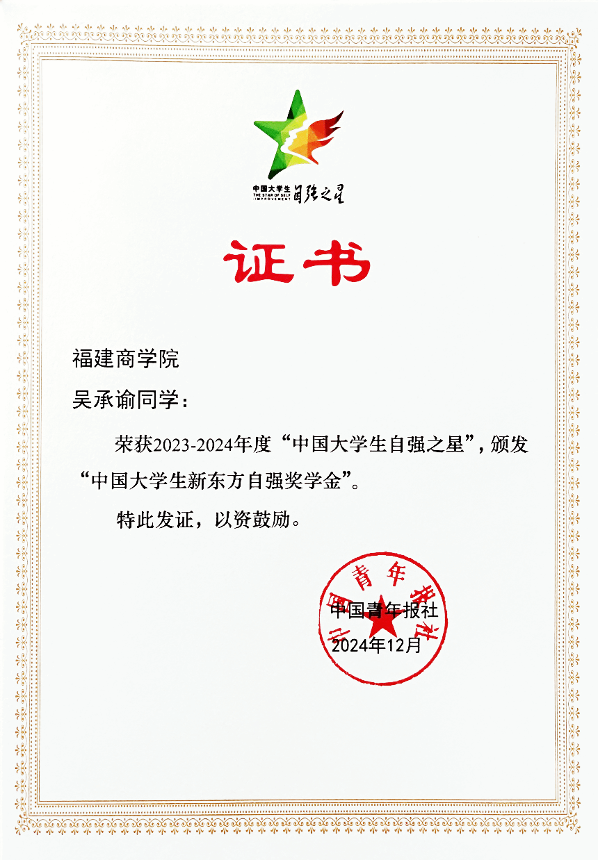 近日,由共青团中央、全国学联指导,中国青年报社、新东方教育科技集团、中国青年创业就业基金会联合开展的2023-2024年度“中国大学生自强之星”推报活动结果揭晓,开云官网传媒与会展学院吴承谕同学荣获“中国大学生自强之星”称号。
