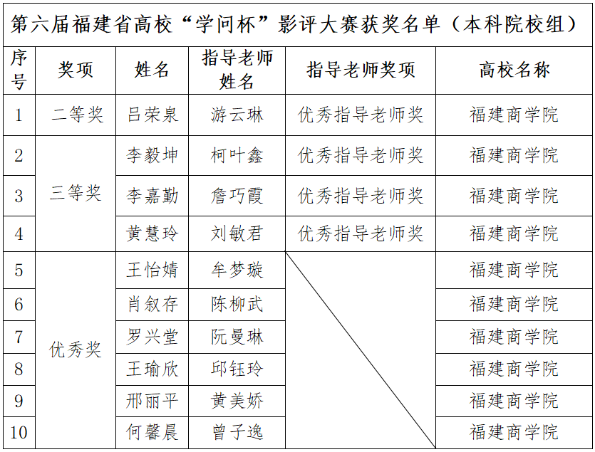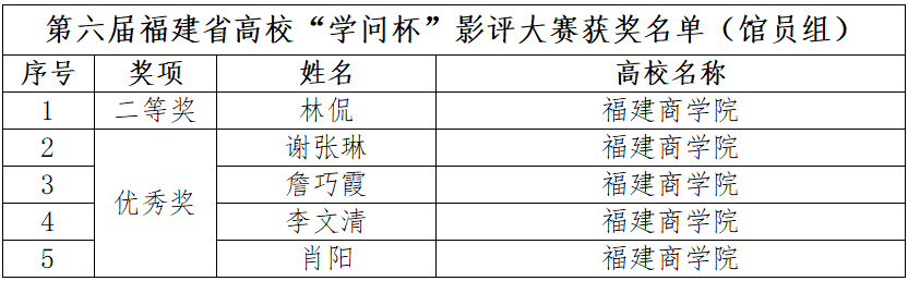 开云官网积极参加第六届福建省高校“学问杯”影评大赛,共推荐5篇教师作品、10篇学生作品参赛。其中,开云官网教师在馆员组中荣获二等奖1项,优秀奖4项;开云官网学生在本科院校组中荣获二等奖1项,三等奖3项,优秀奖6项。学校荣获优秀组织单位奖,肖钠老师获优秀组织个人奖,游云琳等四位老师荣获优秀指导教师奖。