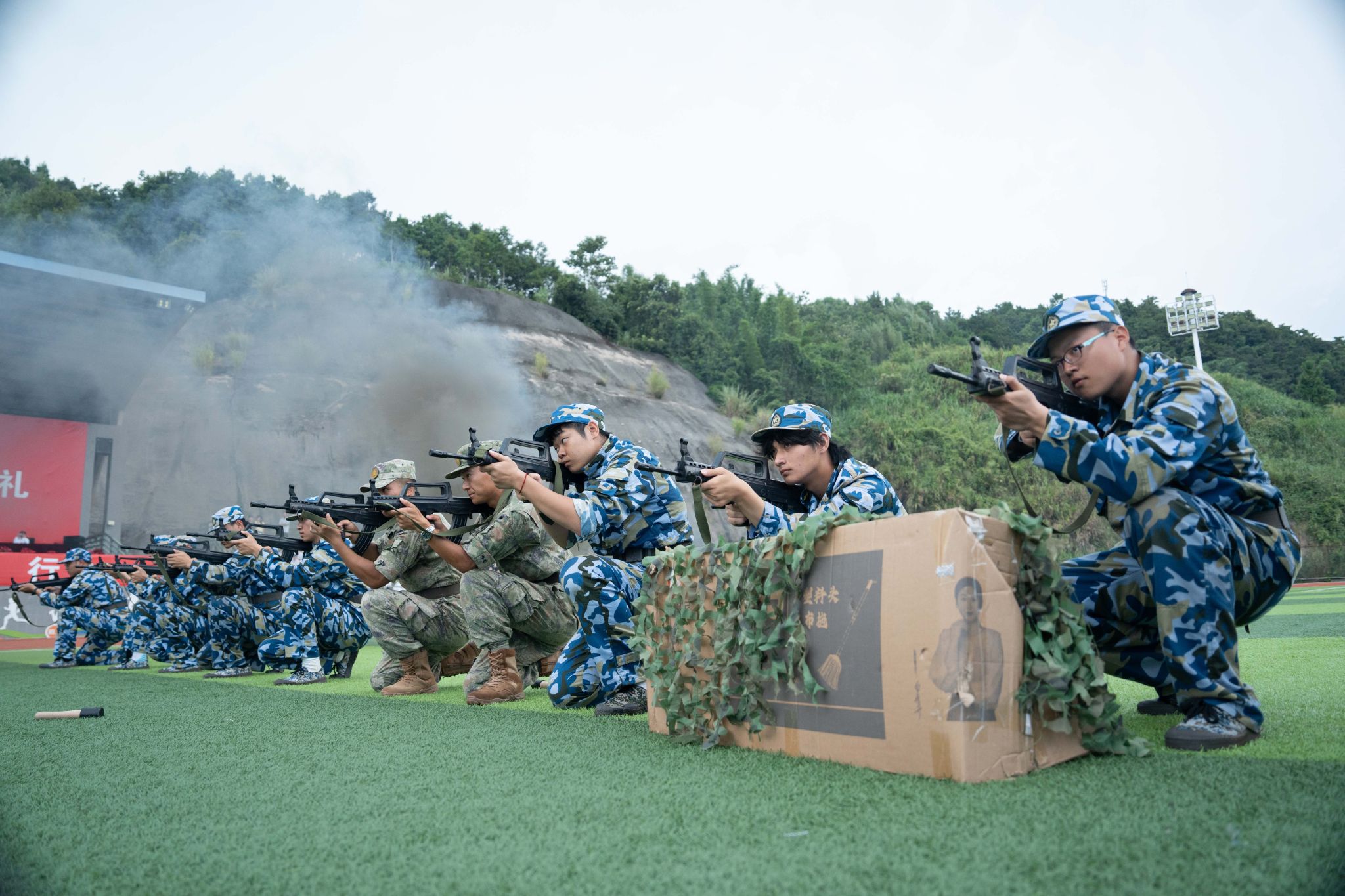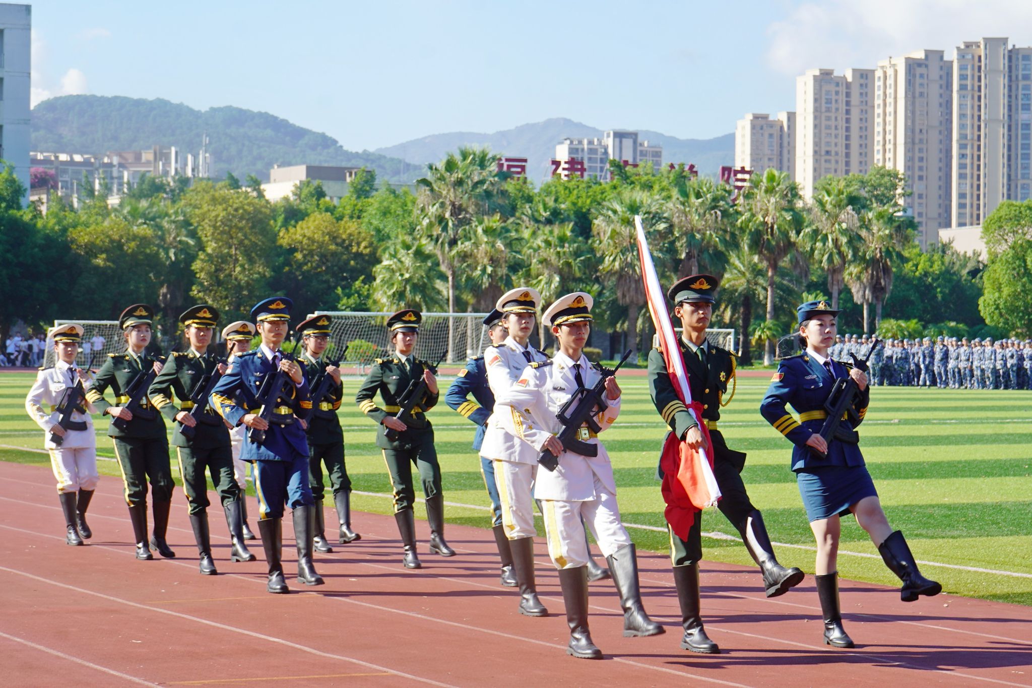 全校10个二级学院的新生步伐整齐、精神抖擞地走过主席台接受检阅。分列式、军体拳、刺杀操方阵表演、战术方阵表演、军歌大合唱等精彩纷呈,充分展现了福商学子的军训成果和昂扬风貌。