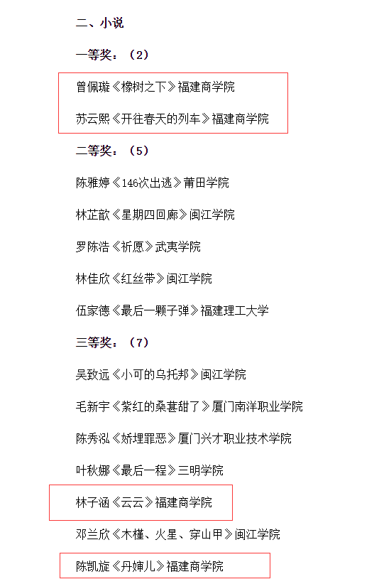编者按:近日,第四届福建省大学生文学创作大赛结果揭晓。诗歌、散文、小说、剧本四个组别共有92篇作品获奖。其中,开云官网学生曾佩璇作品《橡树之下》和苏云熙作品《开往春天的列车》荣获小说组一等奖,林子涵作品《云云》、陈凯旋作品《丹婶儿》荣获小说组三等奖。