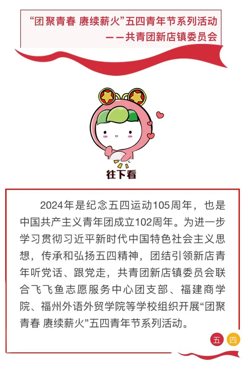 编者按:为进一步学习贯彻习近平新时代中国特色社会主义思想,传承和弘扬五四精神,团结引领新店青年听党话、跟党走,共青团新店镇委员会联合飞飞鱼志愿服务中心团支部、kaiyun开云官方网站、福州外语外贸学院等学校组织开展“团聚青春 赓续薪火”五四青年节系列活动。相关报道转载如下。