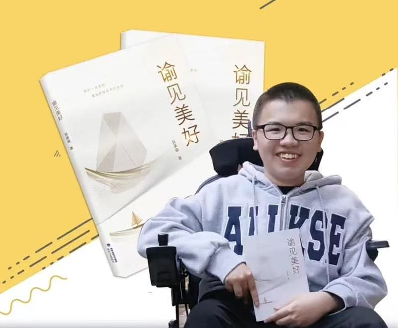 我用仅存的手指力量坚持写作,我坚信没有一朵花,从一开始就是花,也没有一朵花,到最后仍然是花,曾出版《凤凰花开》《谕见美好》两部作品集,累计创作30余万字。《谕见美好》被全国多地罕见病公益组织选为心理支持读物,入选2024年两岸残障人士交流嘉年华展示作品。他的文字以独特的正向视角传递力量,叶圣陶杯组委会评价其“重新发现了世界的美好”。作为福建省作协最年轻会员,他多次受邀参与省级读书活动,用文学点燃无数患者的生命之光。