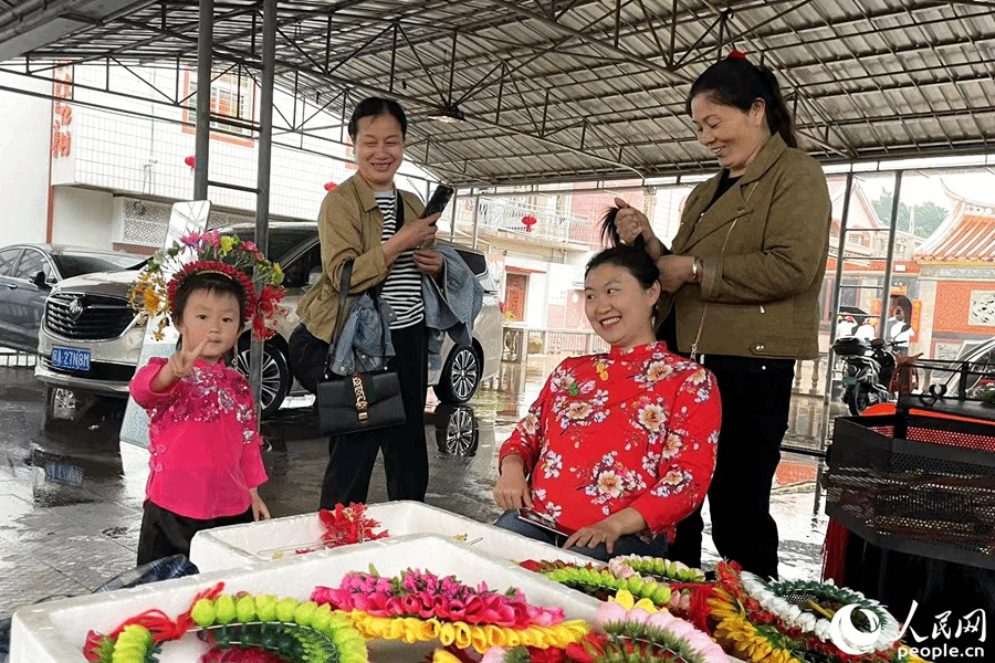接发、盘头、插花,闽南特色蚵壳厝里,村民黄阿嬷笑眯眯地给远道而来的女游客梳妆打扮,细细扎上漂亮的簪花围。专业摄影师为爱美的游客拍摄精致照片。