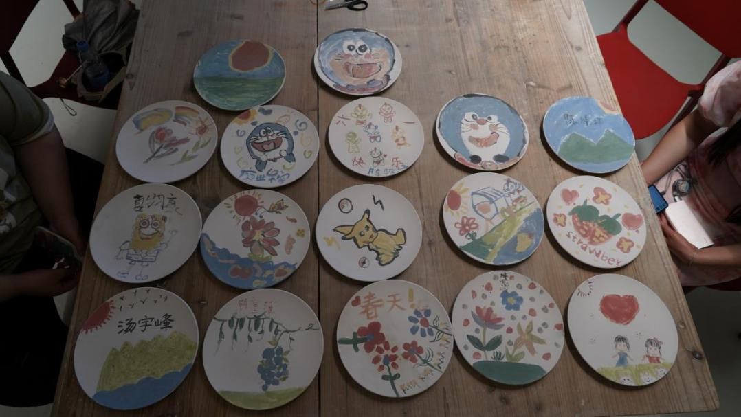釉下彩绘小组细心地为小学生们讲解作画工具的使用,与他们沟通交流设计图案的思路。小学生们充分发挥他们的想象力,在素烧的盘子、杯子上绘出一个个精彩的图案,体验釉下彩绘的乐趣与魅力。