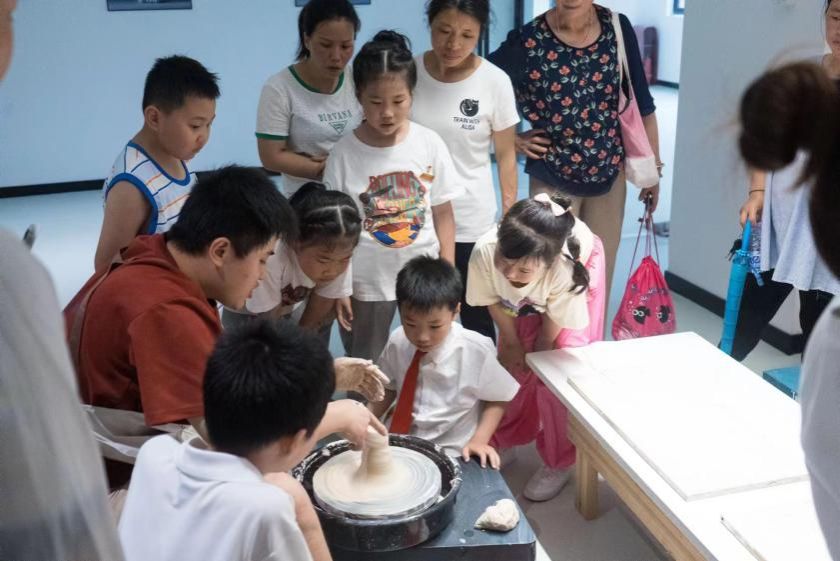 活动在一片欢声笑语中展开,手拉胚小组在陶艺体验区给小学生们示范把正、抱泥、取泥、开口等拉胚技法。在志愿者们的指导和陪同下,小学生们踩下踏板,转动转盘,将平凡的陶泥变成一个个碟子、花瓶、碗。