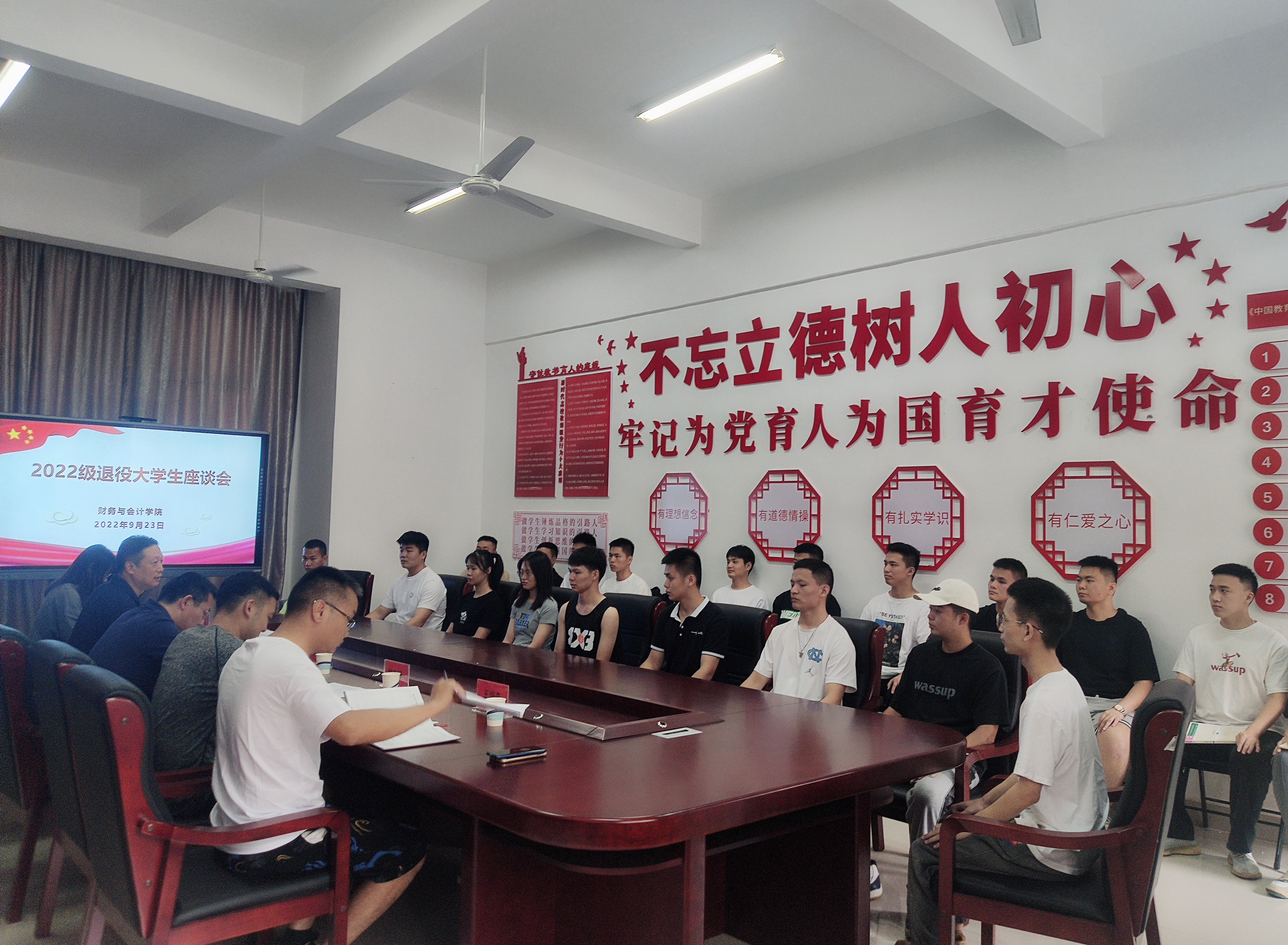 为深入了解退役大学生入学以来在思想、学习、生活等方面的状况,9月23日,财务与会计学院举办2022级退役大学生座谈会,引导退役大学生踔厉奋发、毅勇前行。校武装部负责人,学院学生工作负责人、学工办负责人、新生辅导员及21名退役大学生参加活动。
