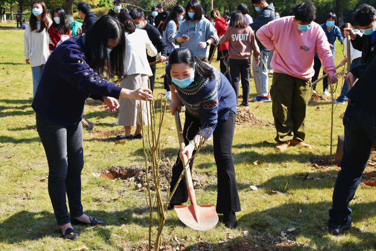 植树现场热火朝天。党员志愿者们在马尾校区开辟出一块空地,充分发扬团结协作精神,经过挖坑培土、扶苗平整、挥锹压实、提水浇灌等环节,合力种下近50“福商之树”。