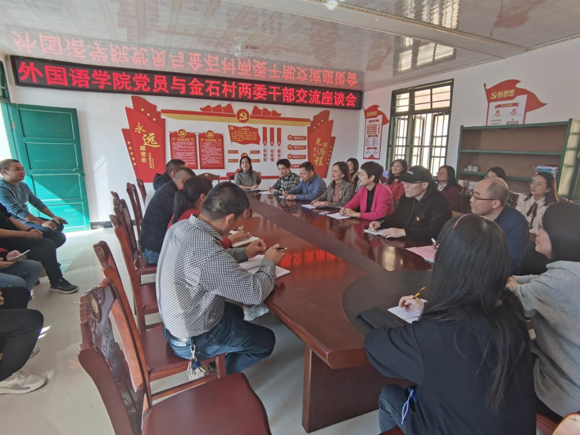 外国语学院师生党员与金石村“两委”干部开展座谈交流,深入了解金石村村情,现场聆听学院驻村干部陈民强老师不辞辛劳、奋战一线的生动事迹,并就双方在资源引流、发展共促、大学生创新创业等方面开展合作进行深入交流。