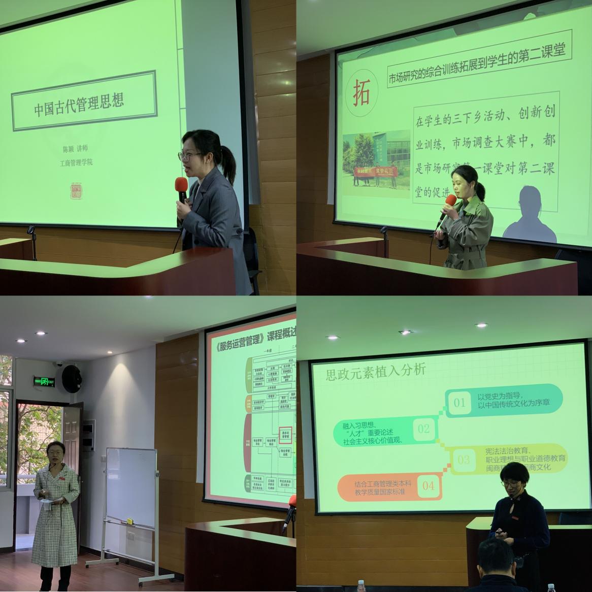 赛前参赛教师们根据比赛要求,编写教案和授课计划表。现场说课环节,市场营销系黄美花老师以如何开展市场调查为切入点,融合社会主义核心价值观,倡导培育并践行“诚信经营”“公平交易”“顾客至上”等积极正确的营销价值观。工商管理系陈颖老师结合专业知识点诠释中国管理思想历史的发展,融入习近平新时代中国特色社会主义思想和党史学习教育,启迪学生爱国热情,突出责任担当。人力资源管理系邓云老师向大家分享了习近平总书记当年在河北正定工作期间,推出“人才九条”的工作经验。工商管理系李冰老师打破服务运营管理与课程思政难以结合的瓶颈,站在学生角度,培养服务意识,把学生也当做教师的服务对象,体现隐性课程思政特点。最终,陈颖老师以其突出的课堂驾驭能力脱颖而出,获得最高分。
