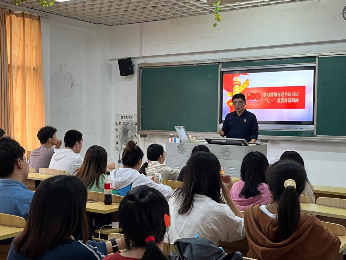 黄旭东老师从“两个一百年奋斗目标“实现中华民族伟大复兴的主题”“四个伟大成就”“伟大建党精神”以及“以史为鉴开创未来的‘九个必须’”等方面阐述了习近平总书记“七一”重要讲话内容,阐释了中国共产党为人民谋幸福、为民族谋复兴的初心使命,回顾了新中国的发展历程。他以学生喜闻乐见的形式,激励青年一代应坚持真理,坚守理想,努力学习,勇于创新。