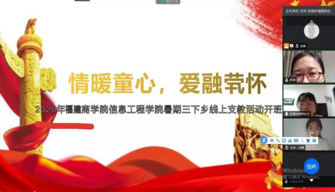 为响应团中央、团省委、校团委关于组织大学生暑期“三下乡”活动的号召,结合团省委推动的关注留守儿童帮扶计划,信息工程学院团委开展以“情暖童心,爱融茕怀”为主题的暑期“三下乡”社会实践活动。特殊时期,活动以线上支教的形式开展。