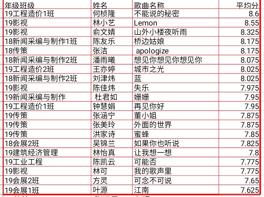 本次十佳歌手初赛的举办方式和以往大为不同,参赛选手先录制一段音频上传到“全民K歌”APP,线上观众给予点赞,再由评委进行评选。线上活动虽具有一定的局限性,但同学们的参与积极性不减,居家抗“疫”的他们秉持着对歌唱的热爱,认真准备,精心录制视频。45位同学演绎的歌曲,获得了线上很多观众的点赞。比赛截止后,通过观众点赞和评委们的统一评分,最终来自2019级工程造价1班的何帧隆、2019级影视多媒体技术专业的林小艺、俞文婧等20位选手脱颖而出,成功进入了学院十佳歌手复赛。