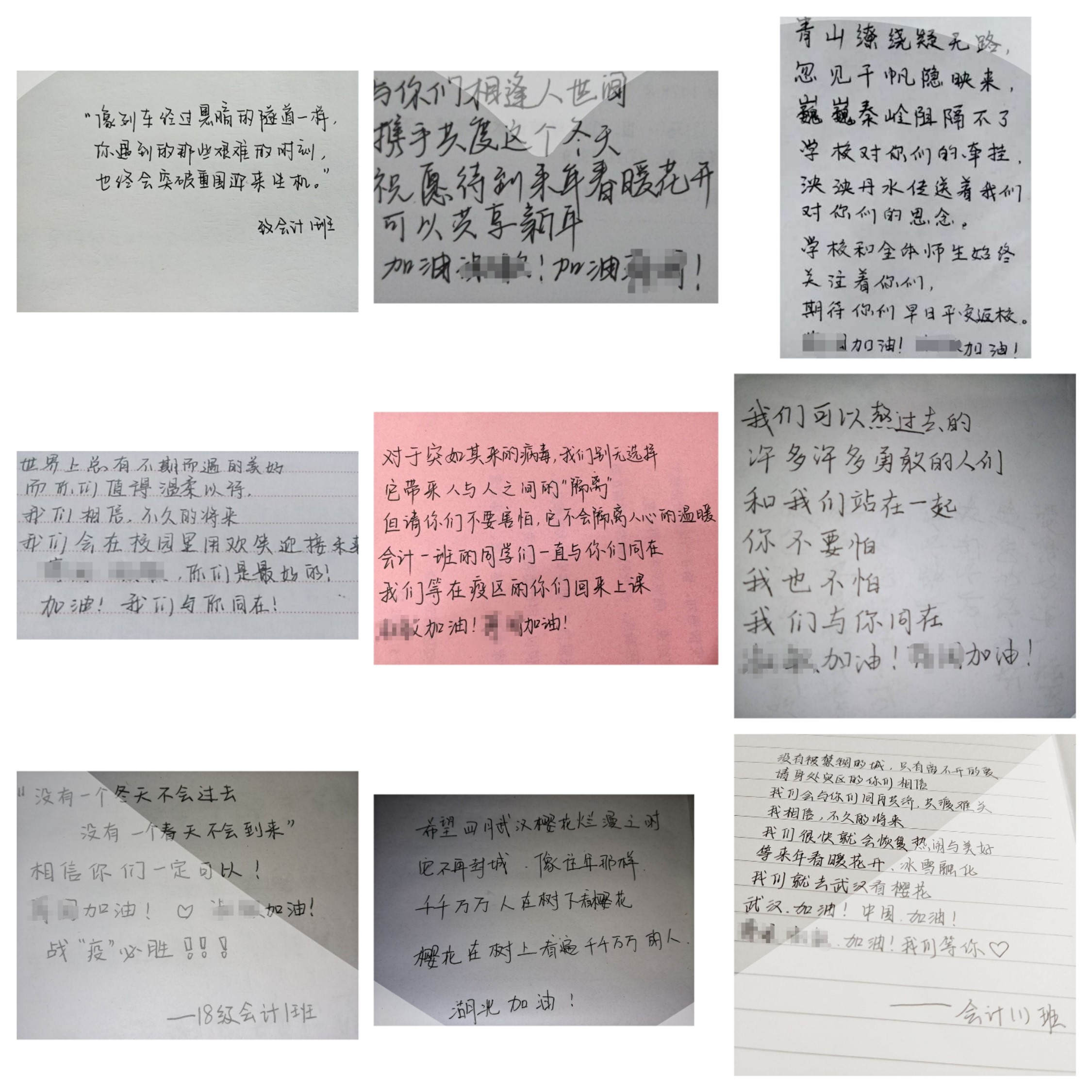 辅导员们通过千里传声电话连线财会学院的每一位湖北籍学生及其家长,全面了解滞留湖北疫区同学状况,向他们转达了学院领导、老师们的关心与慰问,详细询问了学生与家人的身体状况和学习情况,了解当地的防控措施,叮嘱学生要科学防疫、加强身体锻炼、加强学习,要相信乌云遮不住升起的太阳,疫情挡不住春天的来临,坚定同心战“疫”的信心,共同夺取抗疫阻击战的胜利。此外,财会学子通过手写祝福的形式表达了对湖北籍同学的关心与爱,这些祝福像是冬天里的暖阳,像夏天里的微风,聚集了财会学子对湖北籍同学满满的爱,虽远隔千里,但心与心连在一起,定会带给他们最温暖的力量。在收到同学们通过手机传递过来的祝福时,财会学院的湖北籍学生深受感动,表示目前自己和家人身心俱佳,会全力支持配合当地政府和学校的工作与安排,与全校师生一起打赢疫情防控阻击战。