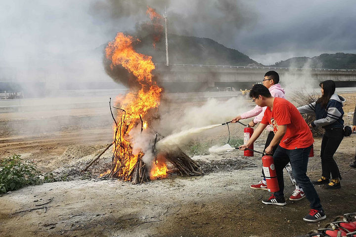 下午2:30分演练正式开始。马尾校区9号楼内,同学们在安保人员的带领下,用毛巾捂住口鼻、半蹲身体,分别从2、3、4、5楼层的两个楼梯出口处紧急向楼下空地疏散,整个过程迅速而有序。在灭火器的实操演练中,参加演练的师生挨个上前对灭火器进行实际操作,迅速将点燃的干柴堆扑灭。