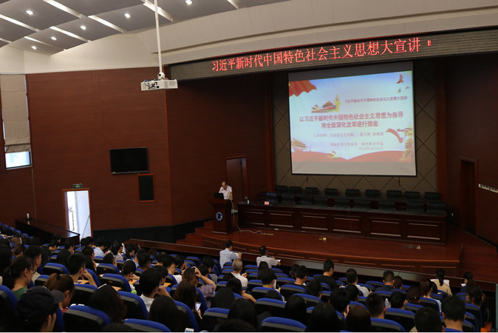 为进一步引导师生深入学习习近平新时代中国特色社会主义思想,10月9日下午,国际经济与贸易系会同海外教育学院特邀学校党委讲师团成员、马克思主义学院副教授董立刚在马尾校区学术报告厅为师生作了题为“以习近平新时代中国特色社会主义思想为指导,将全面深化改革进行到底”的主题宣讲。两系(院)全体教职工和学生代表200多人参加了宣讲报告会。