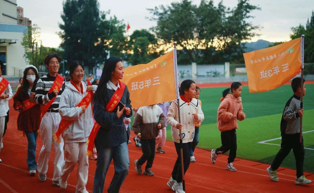 志愿者与小学生们共同跑操