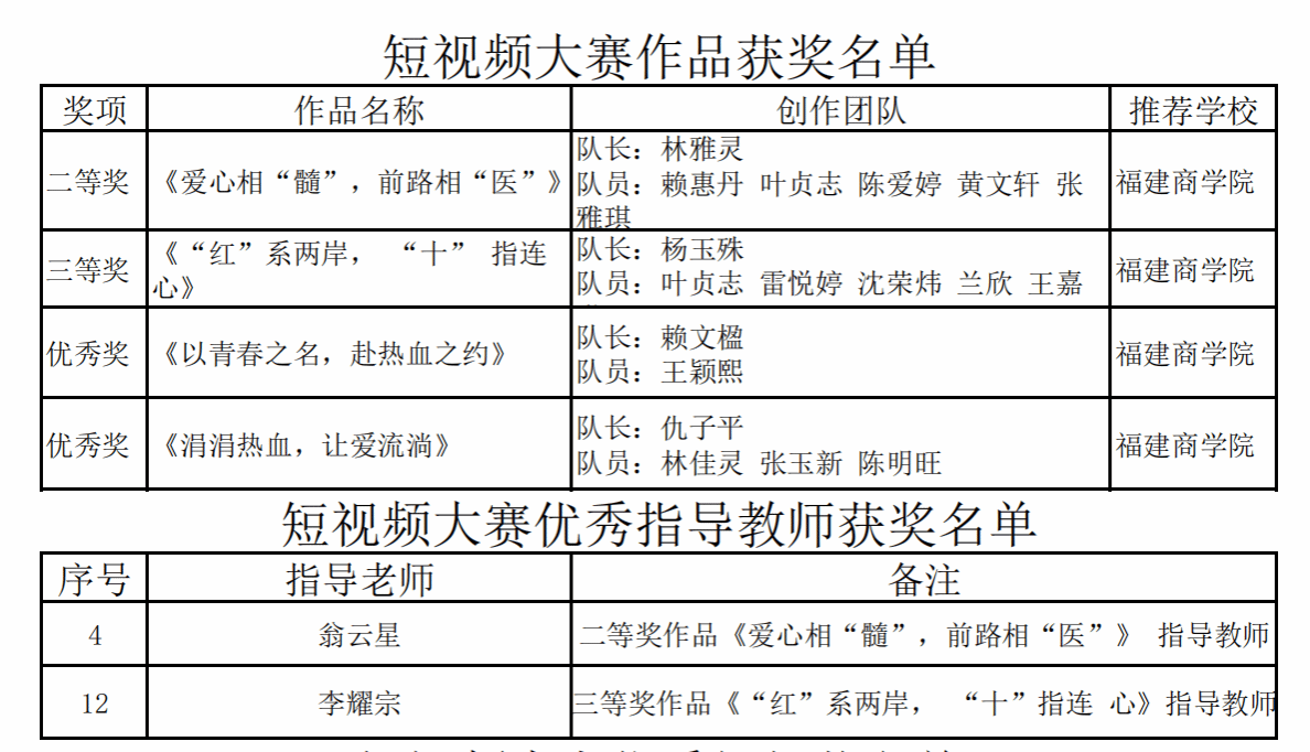 近日,由福建省红十字会主办的第三届闽台红十字大学生短视频大赛落下帷幕。开云官网选送的微视频作品获二等奖1项,三等奖1项,优秀奖2项。2位老师被评为优秀指导教师,开云官网红十字会荣获优秀组织奖。