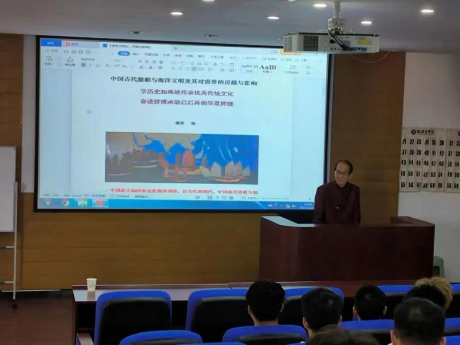 顿贺教授介绍了中国作为造船航海大国的历史,从葫芦、筏、皮囊、木桨、独木舟、木板船的诞生等,详细阐述了中国古代至近代船舶与海洋文明的发展历程。他同时引用徐福东渡、鉴真东渡等故事以及丝绸之路的发展历史,让同学们生切地感受到中国船舶与海洋文明对世界的贡献及影响,对中国船舶的发展史有了更加深入的认识。