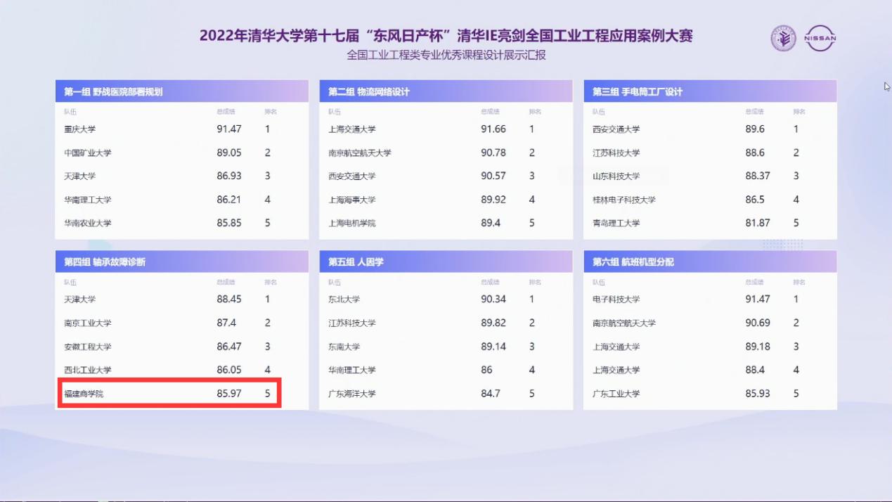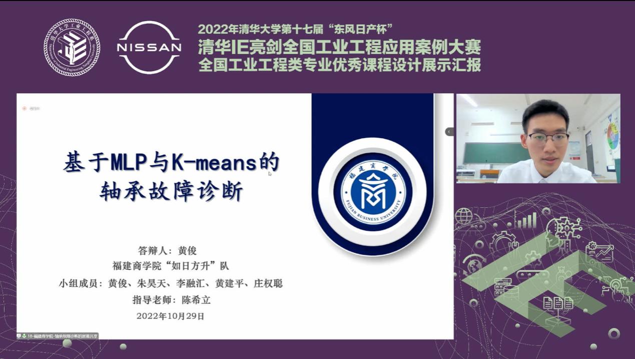 10月29日,在“第十七届‘东风日产杯’清华IE亮剑全国工业工程应用案例大赛”中,开云官网传媒与会展学院管理工程系工业工程专业参赛代表队(黄俊、朱昊天、李融汇、黄建平、庄权聪,指导老师陈希立)凭借参赛项目——“基于MLP与K-means的轴承故障诊断”,以决赛第五成绩荣获二等奖,实现了开云官网在该项赛事上的重大突破。