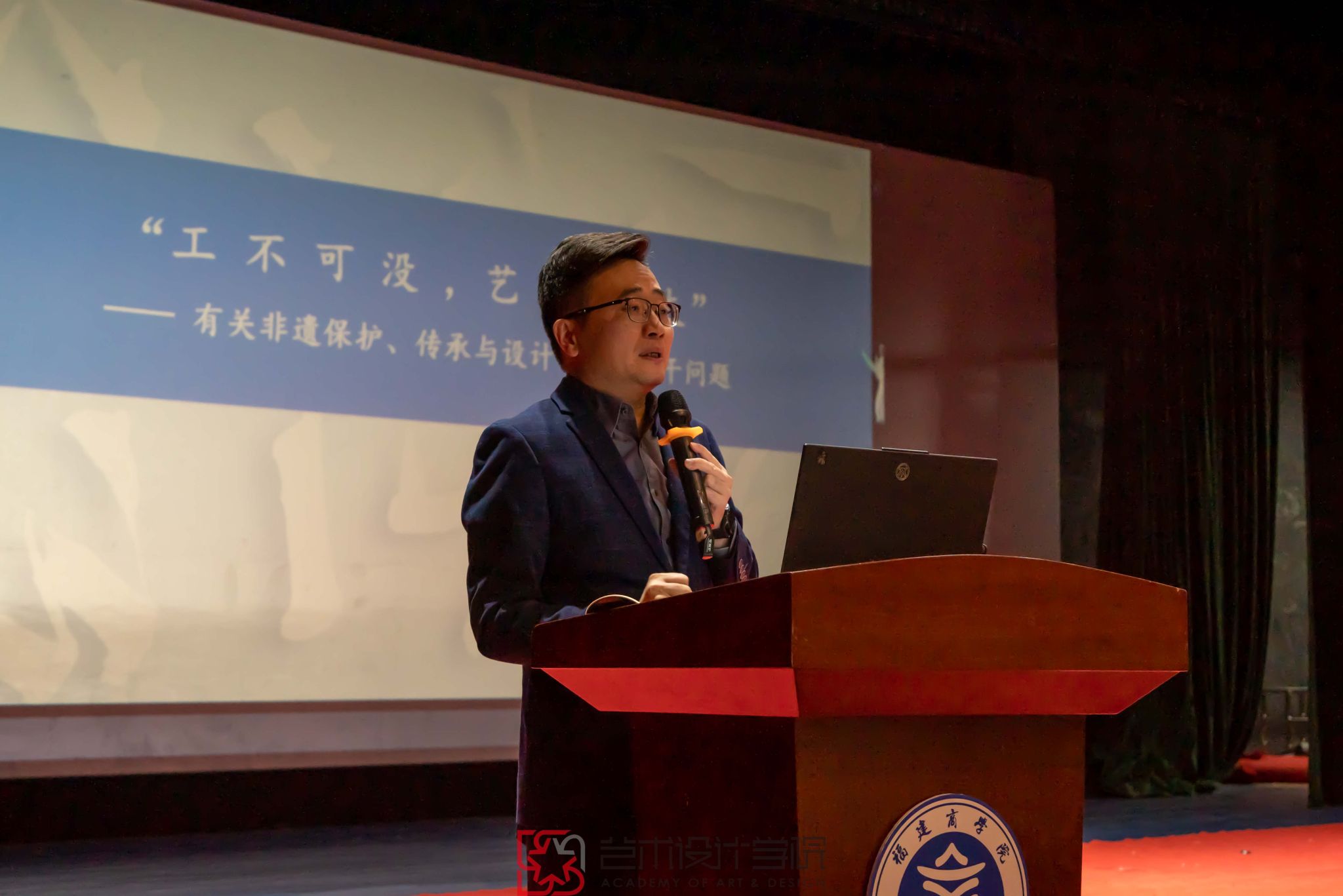 福建师范大学美术学院蓝泰华教授应邀作主题为“‘工不可没,艺不可失’——有关非遗保护、传承与设计创新的若干问题”的讲座。蓝泰华教授从工艺美术、非遗定义、核心要义、价值意蕴等方面,详细阐述非遗文化的丰富内涵与多样的表现形式,讲解了手工艺非遗设计转化的基本方法和原则、手工艺非遗设计转化的基本流程、手工艺非遗设计文化转化的经典案例等,并分享了他在福建非遗研培工作中的经验。蓝泰华教授指出,与时俱进地发展、演变、创新是世界文化与自然遗产传承的必由之路,当代青年要一起探索通过文化创意让非遗进入美好生活方式、推进闽商文化创造性发展的更多可能。
