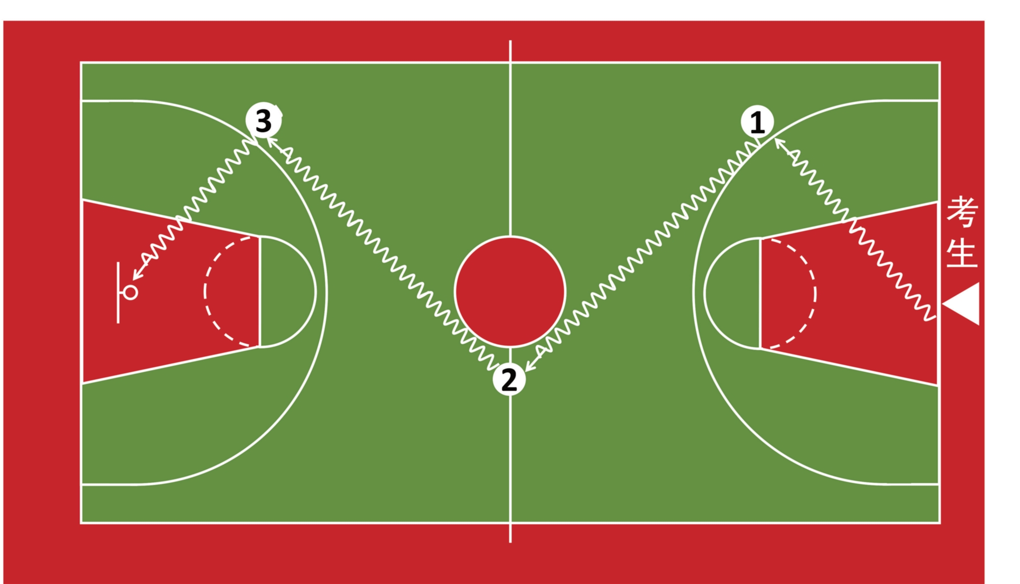1、考试方法:如图2所示,考生在球场端线中点外出发区持球站立,当其身体任意部位穿过端线外沿的垂直面时开始计时。考生用右手运球至①处,在①处做右手背后运球,换左手向②处运球,至②处做左手后转身运球,换右手运球至③处,在③处做右手胯下运球后右手上篮。球中篮后方可用左手运球返回③处,在③处做左手背后运球,换右手向②处运球,在②处做右手后转身运球,换左手向①处运球,在①处做左手胯下运球后左手上篮。球中后做同样的动作再重复一次,最后一次上篮命中后,持球冲出端线,考生身体任意部位穿过端线外沿垂直面时停止计时,记录完成的时间。每人测试2次,取最好成绩。