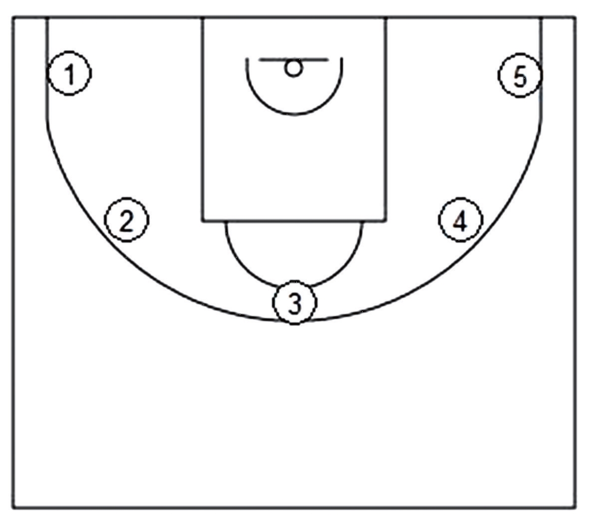 1、考试方法:在三分线上设置五个投篮点投篮,如图1所示;在每个点位放置4个球,共20个球。考生须从第1投篮点或第5投篮点开始投篮,按逆时针或顺时针方向依次投完每个点位的4个球。测试时间为1分钟。要求考生必须在弧线外投篮,球出手前双脚不得踩线,若踩线投中则计为无效投篮,不得分。每人测试2次,取最好成绩。