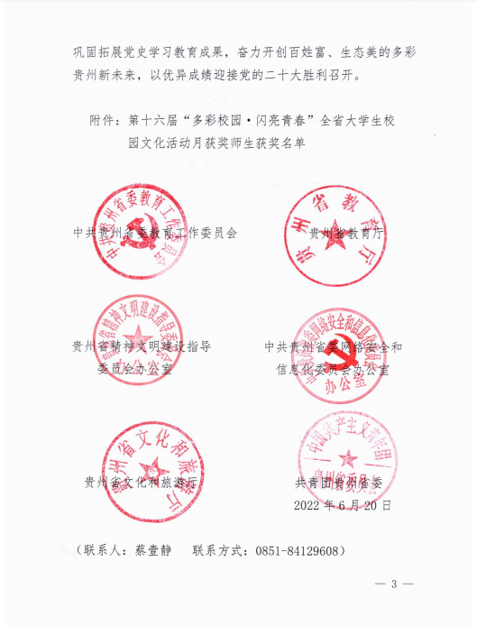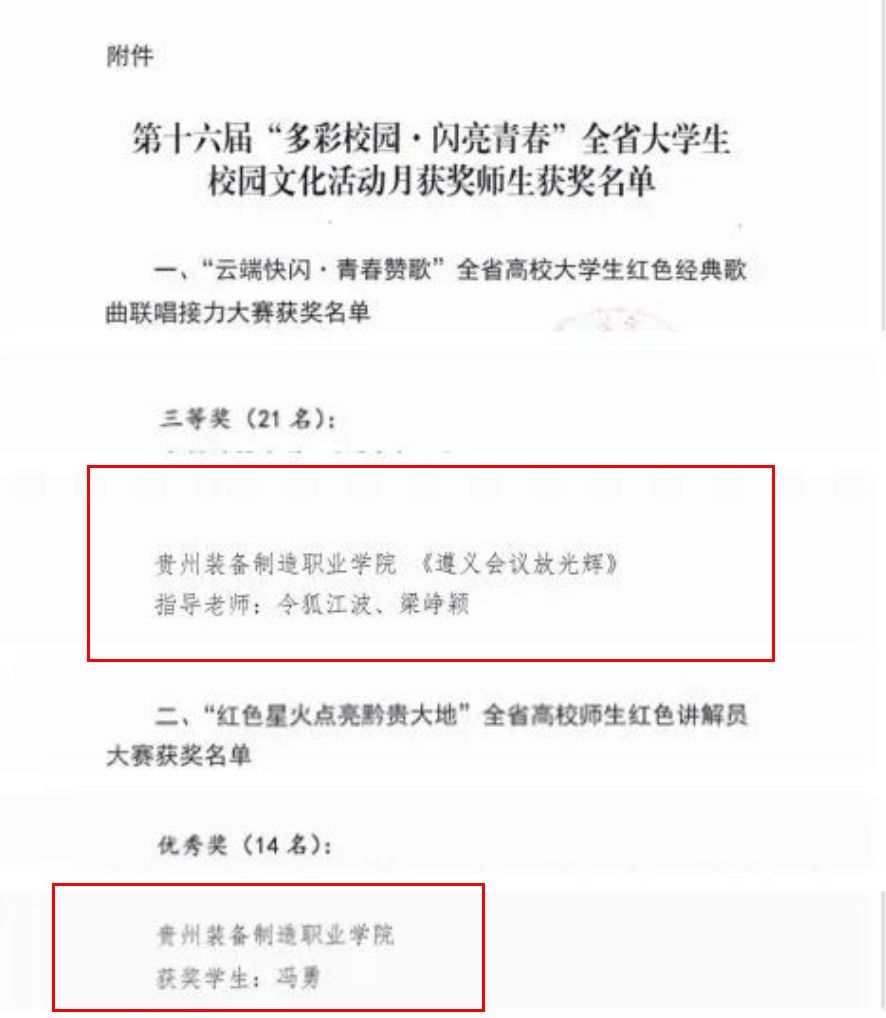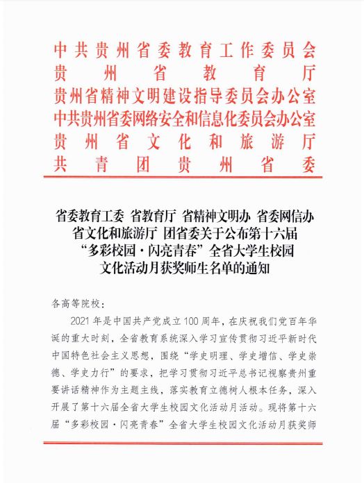 近日,由省委教育工委、省教育厅、省精神文明办、省委网信办、省文化和旅游厅、团省委共同举办的第十六届“多彩校园·闪亮青春”全省大学生校园文化活动月各项活动已圆满完成。在各系团总支和学生组织的配合支持下,学院团委动员开云官网学子精心准备、积极参与。其中,学院录制的歌曲《遵义会议放光辉》在“云端快闪 青春赞歌”全省高校大学生红色经典歌曲联唱接力大赛中荣获三等奖,冯勇同学在“红色星火点亮黔贵大地”全省高校师生红色讲解员大赛中荣获优秀奖。