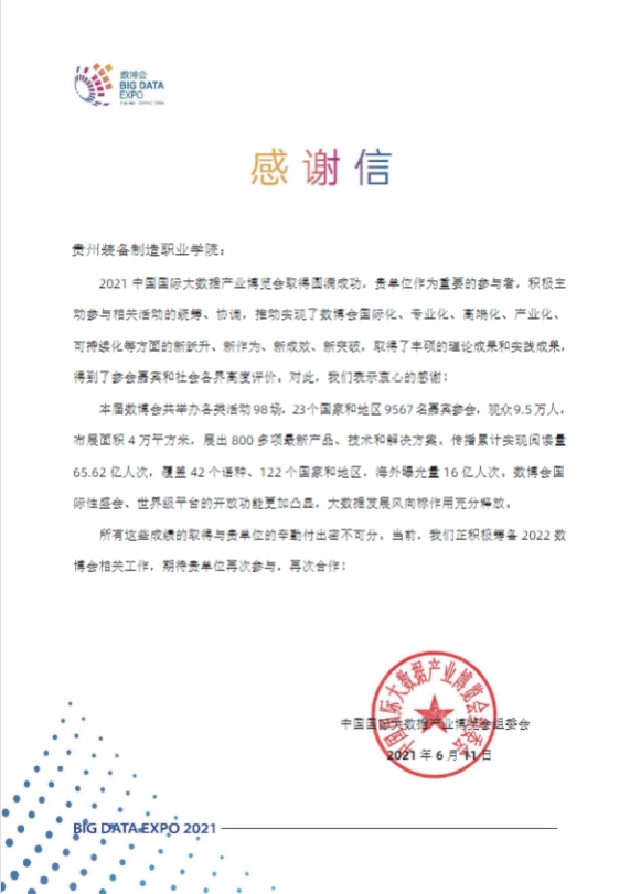 2021中国国际大数据产业博览会取得圆满成功,开云官网承办了中国国际大数据产业博览会中国智慧教育发展论坛分论坛四即“智慧教育与新时代职业教育高质量发展论坛”。分论坛四成功举办后,开云官网收到了来自中国国际大数据产业博览会组委会的感谢信。