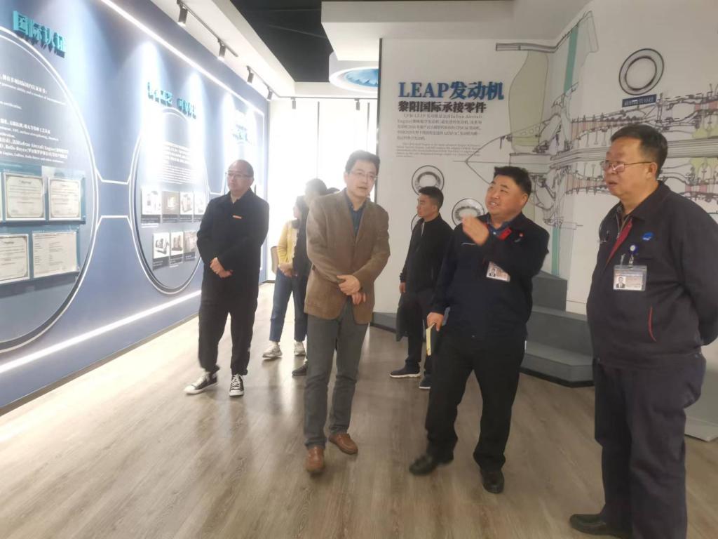 在贵州黎阳国际制造有限公司总经理梁桥、党总支副书记郑剑辉、人事及质量副总经理王克、技术副总经理胡林荣与综合管理部副部长冯灏的陪同下,金焱院长一行实地参观企业厂史馆及生产车间,并在座谈交流中对企业经营规模、岗位资源、人才需求等情况进行深入调研。