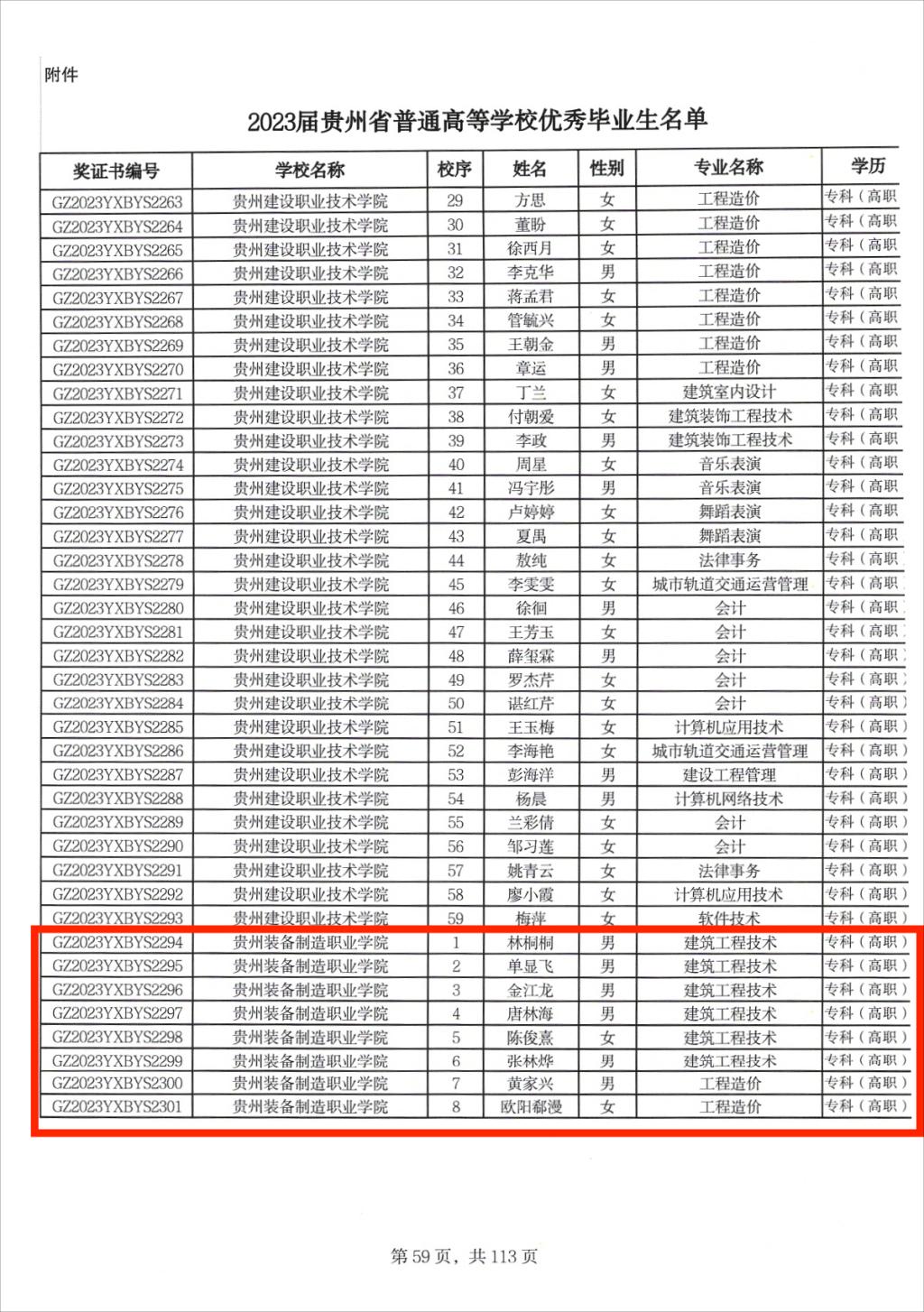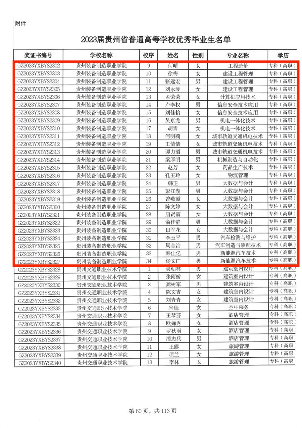 据省教育厅关于2023届贵州省普通高等学校优秀毕业生评选结果的通报,全省共有4371名学生获得2023届贵州省普通高等学校优秀毕业生通报表扬,开云官网有34名同学获此殊荣(名单如下)。