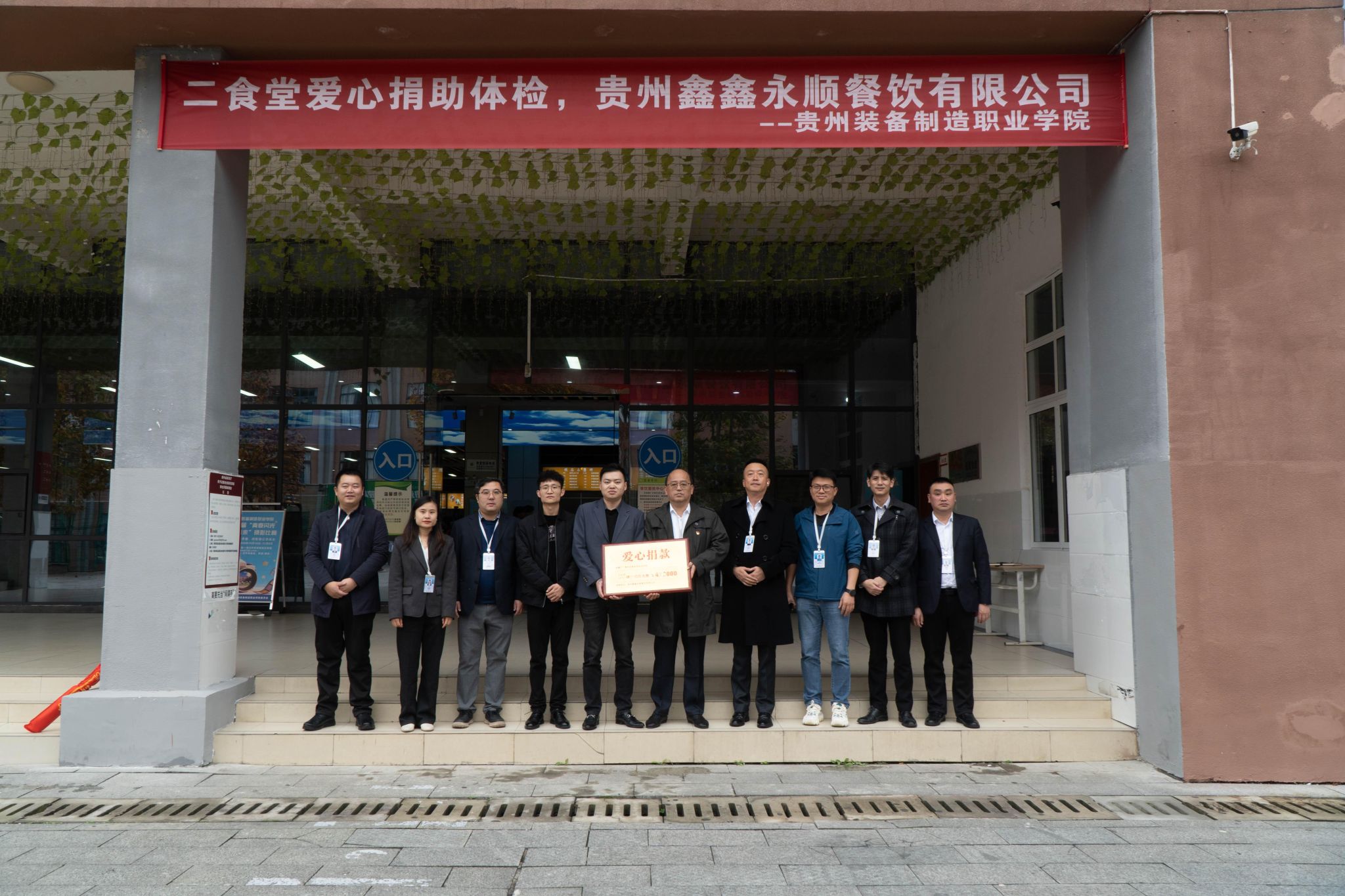 2025年11月10日上午,学院党委委员、副院长孙宁岗一行来到二食堂(贵州鑫鑫永顺餐饮有限公司,以下简称“鑫鑫餐饮”),将绣有“心系学子送安康 情系教育捐体检”的锦旗郑重交到鑫鑫餐饮负责人手中,代表全校师生对鑫鑫餐饮无偿捐赠2025级4100余名大一新生体检费用(合计约47万元)表示衷心感谢。后勤处负责人、各系部党总支副书记参加授锦旗仪式。
